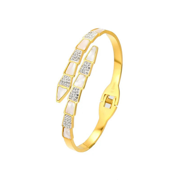 Enhance your style with our luxurious 18k Gold Serpentine Diamantés Bracelet. Made with high quality materials, this bracelet is adorned with sparkling diamantés that catch the light and add a touch of elegance to any outfit. A must-have accessory for any fashion-forward individual.