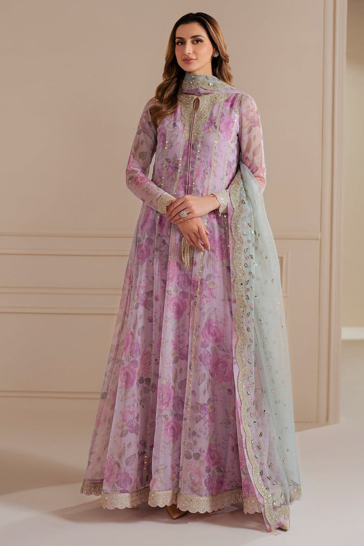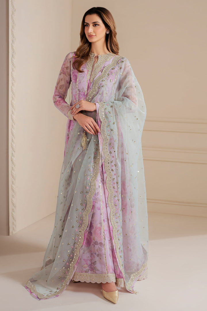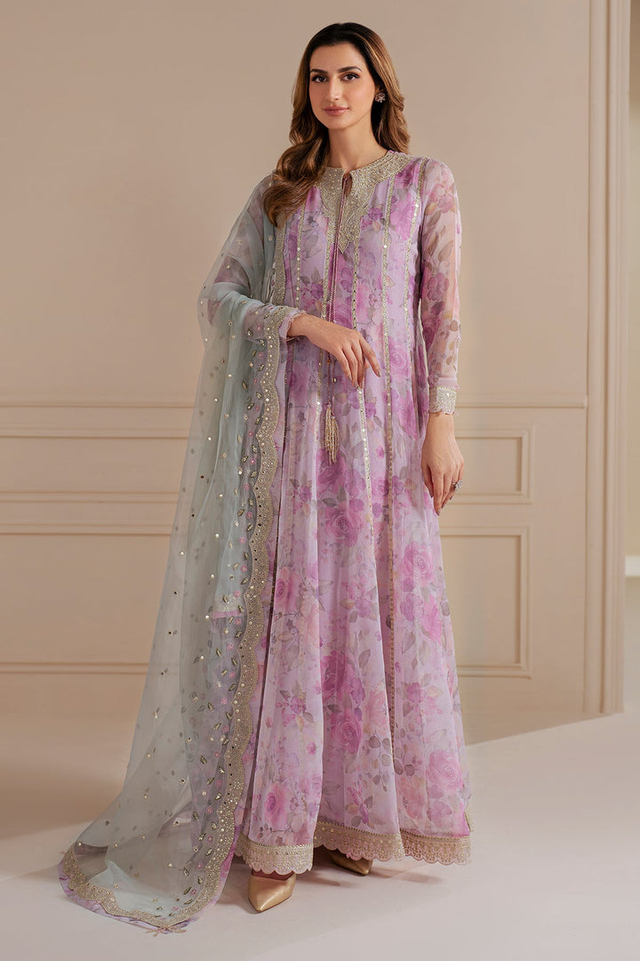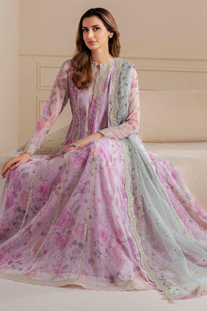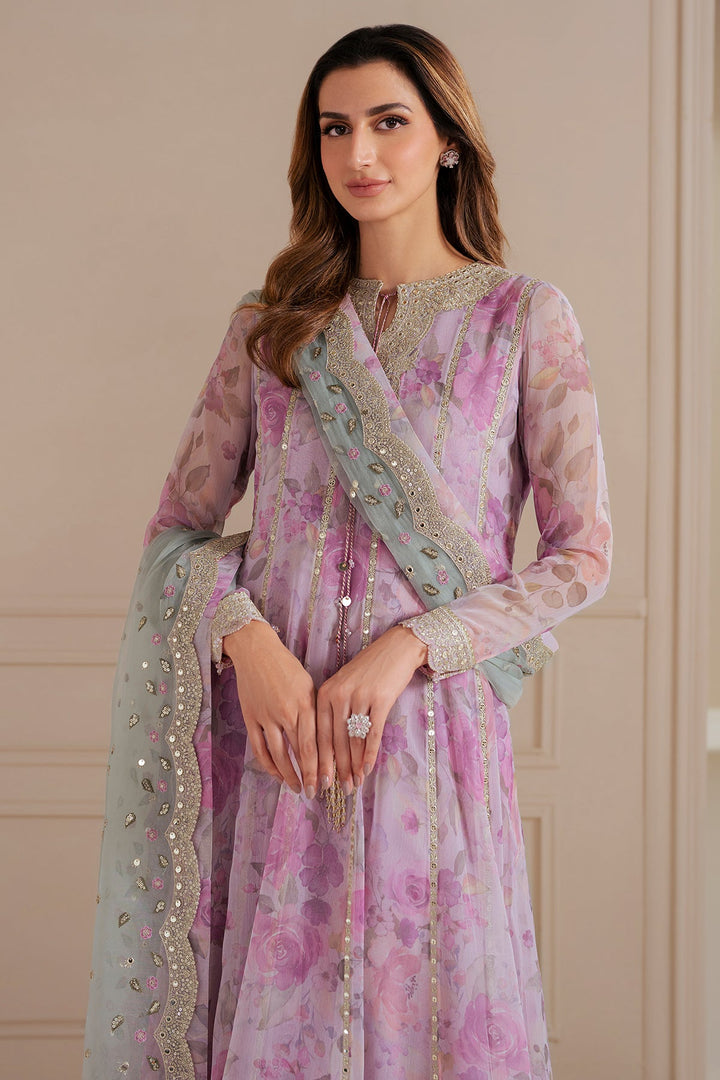 Crafted with elegance, this chiffon shirt features a digital print. It is complemented by an embroidered neckline patch and panels border, along with embroidered borders on the front, back, and sleeves. The organza dupatta adds a delicate touch while the dyed rawsilk bottom completes the look.
